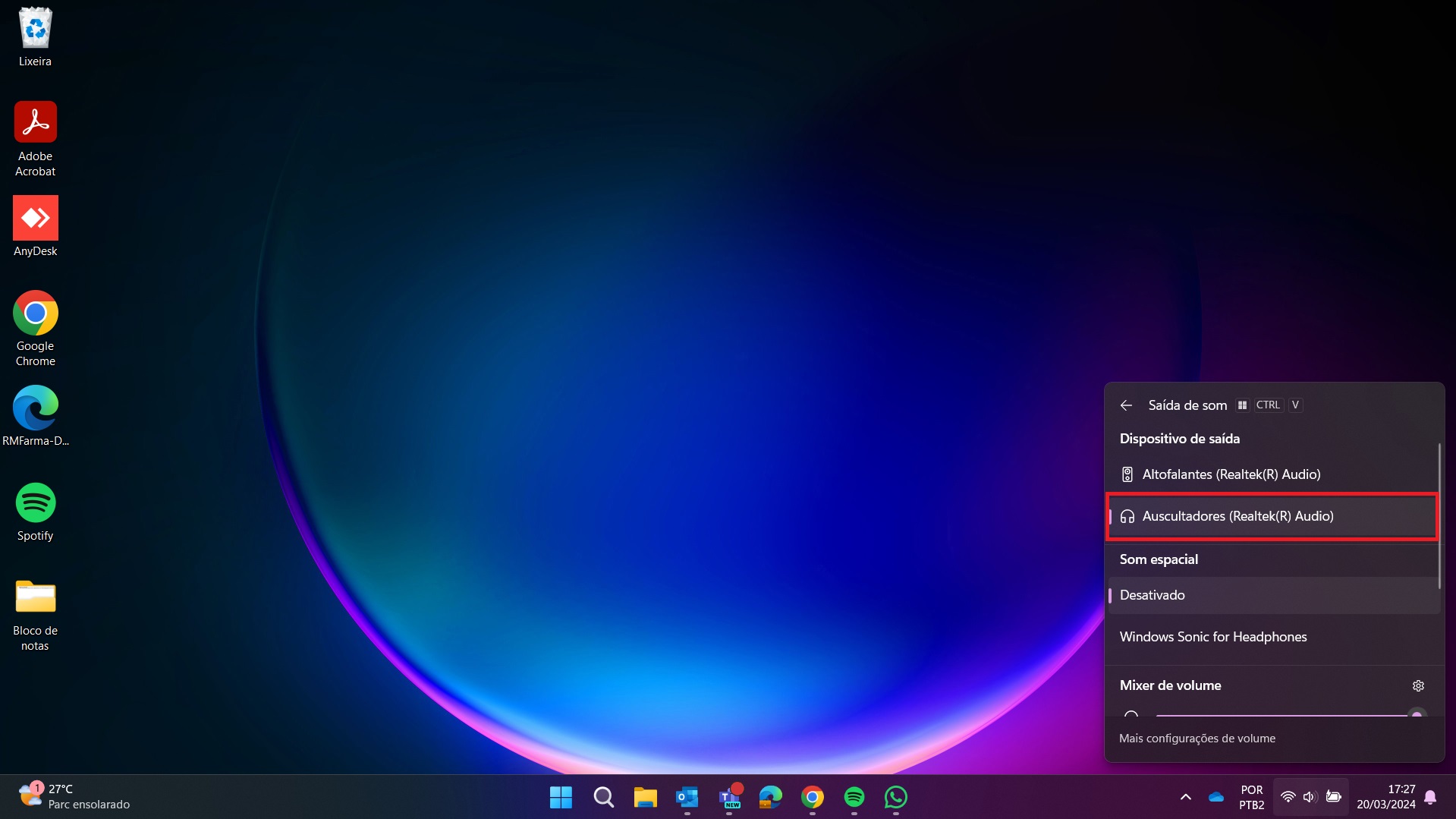 Se você estiver com o fone conectado verifique se a opção "Auscutadores" está sendo exibida e está selecionada, caso ela apareça mas não esteja selecionada basta seleciona-la e se não estiver sendo exibida mesmo com o fone conectado, reinicie o notebook.