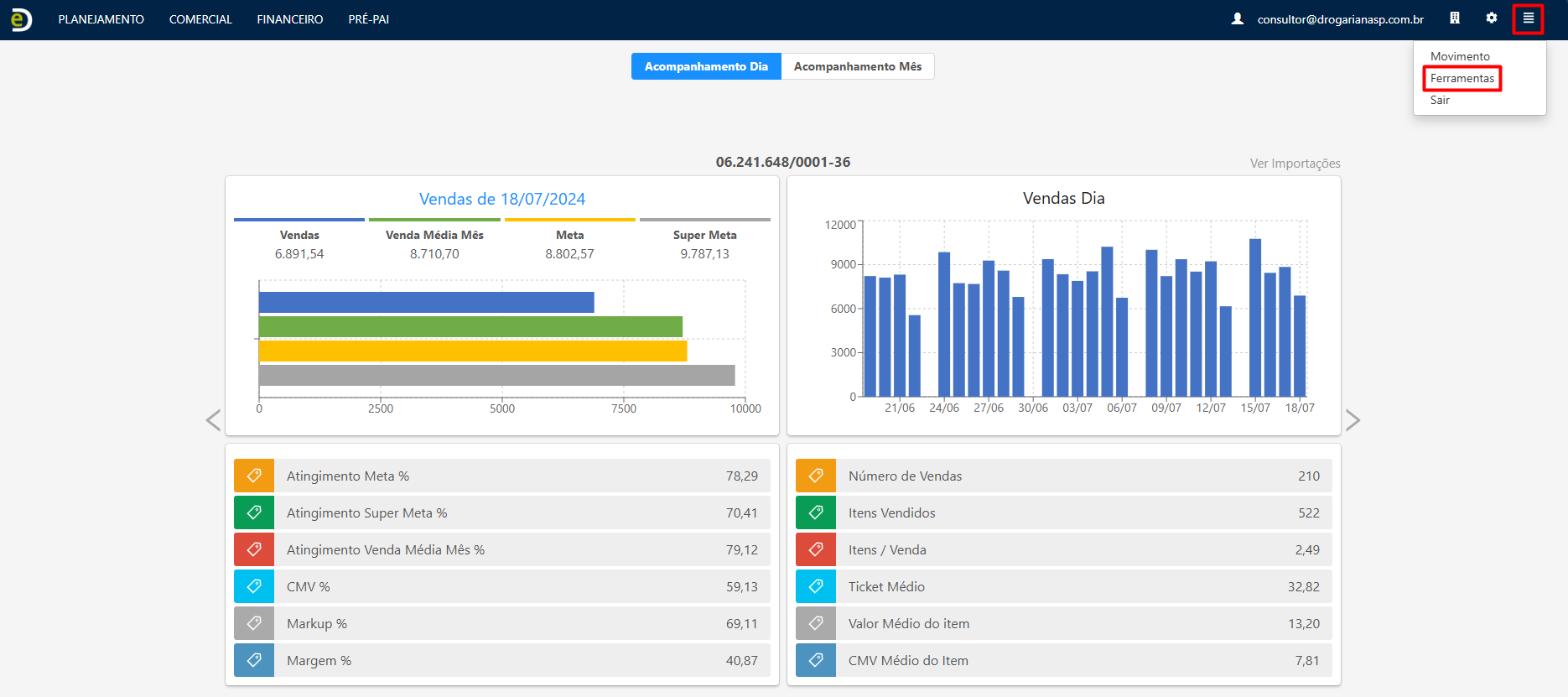 - Na conta do licenciado, clique na opção "Utilitários" e depois em "Ferramentas":