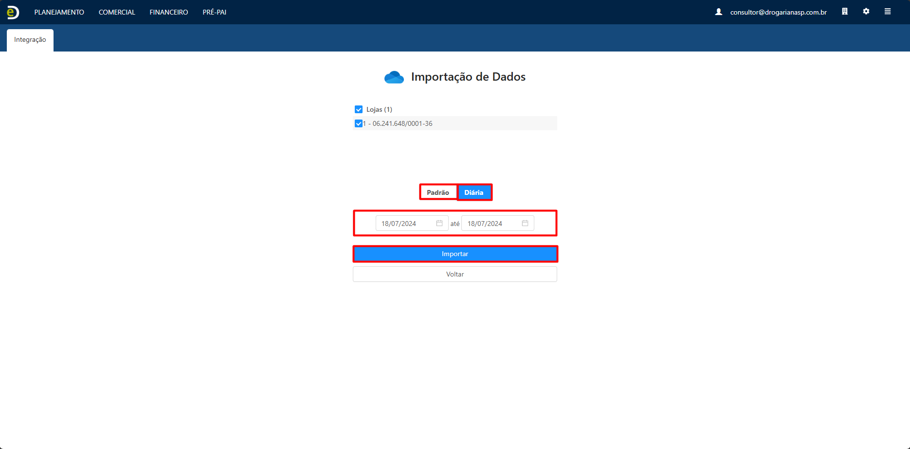- Selecione a opção "Diária", selecione a data na qual você quer buscar, e clique em "Importar". Depois de importado, faça a mesma coisa com a opção "Padrão":